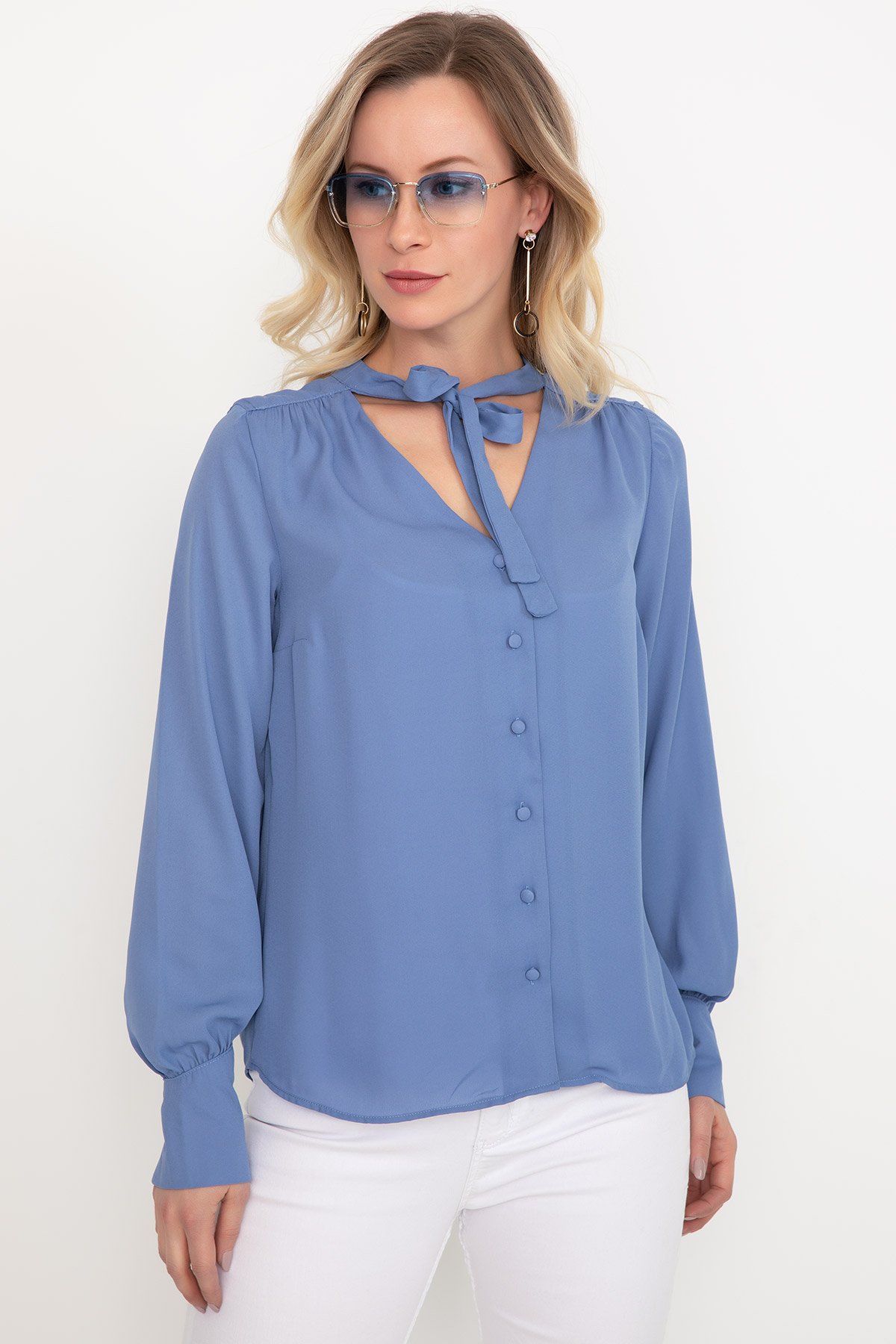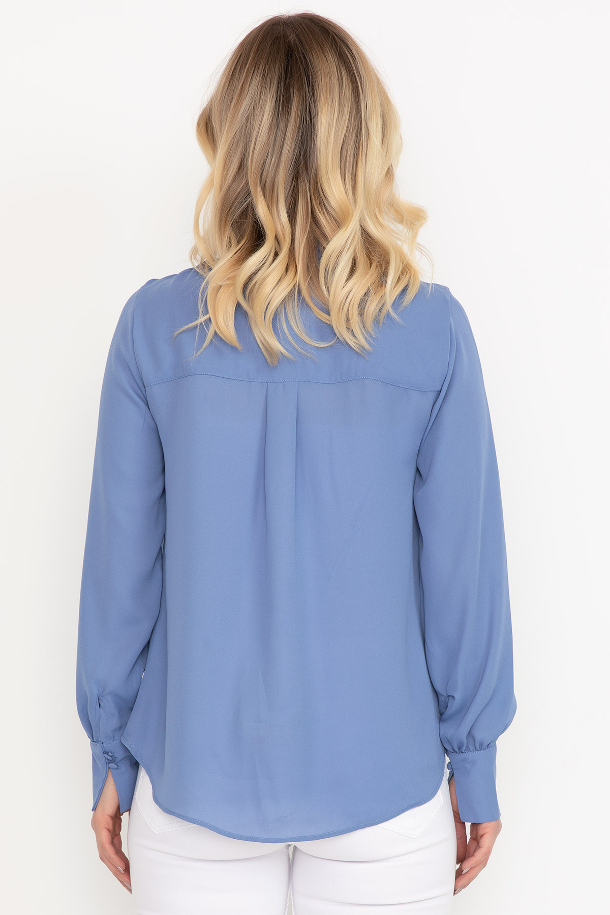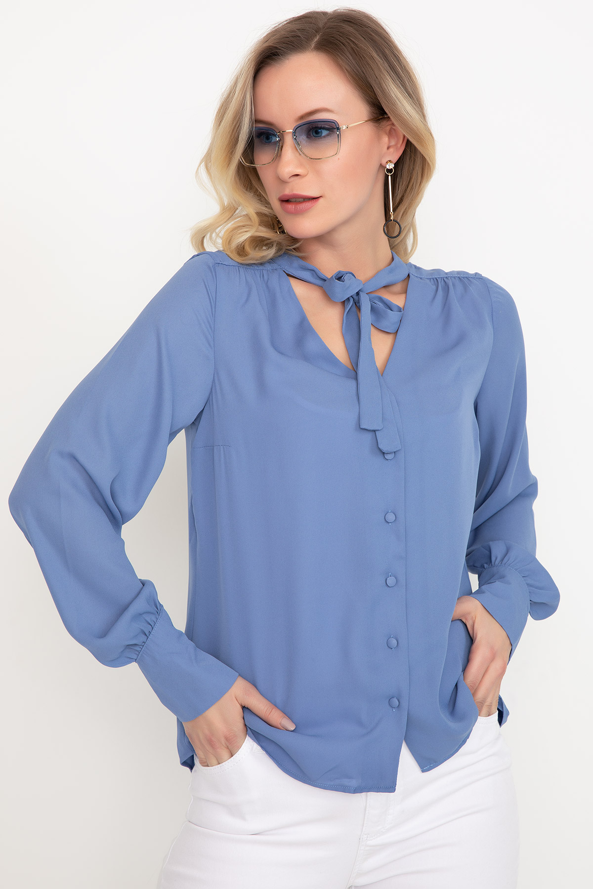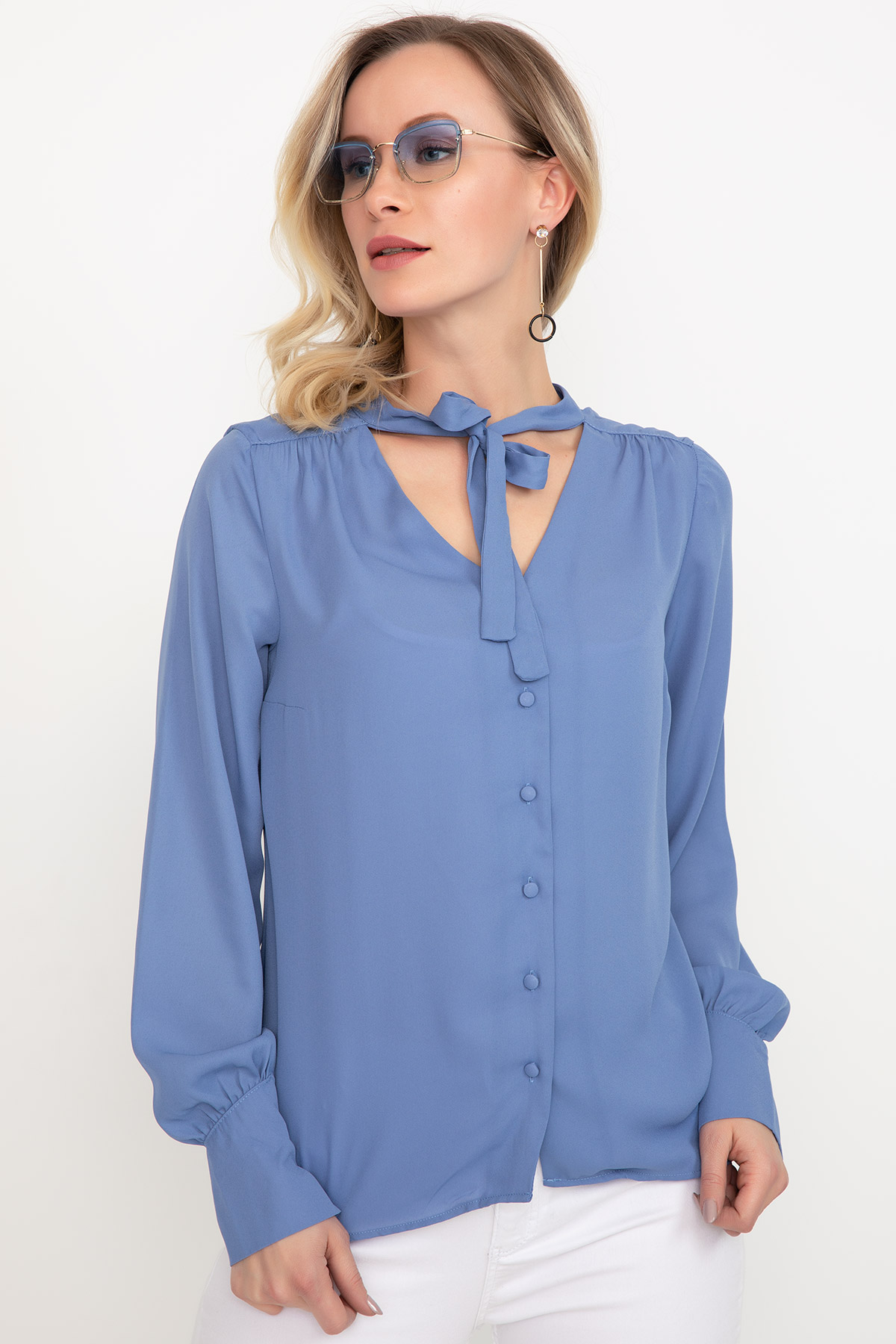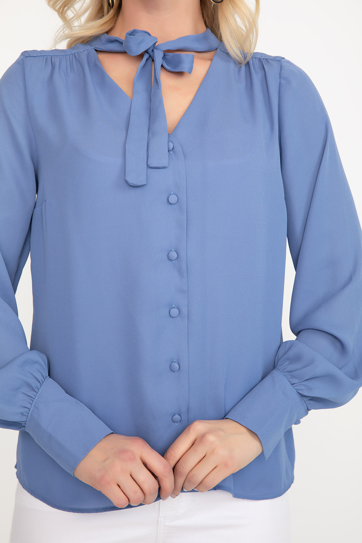 Bağcıklı Şifon Gömlek-Mavi