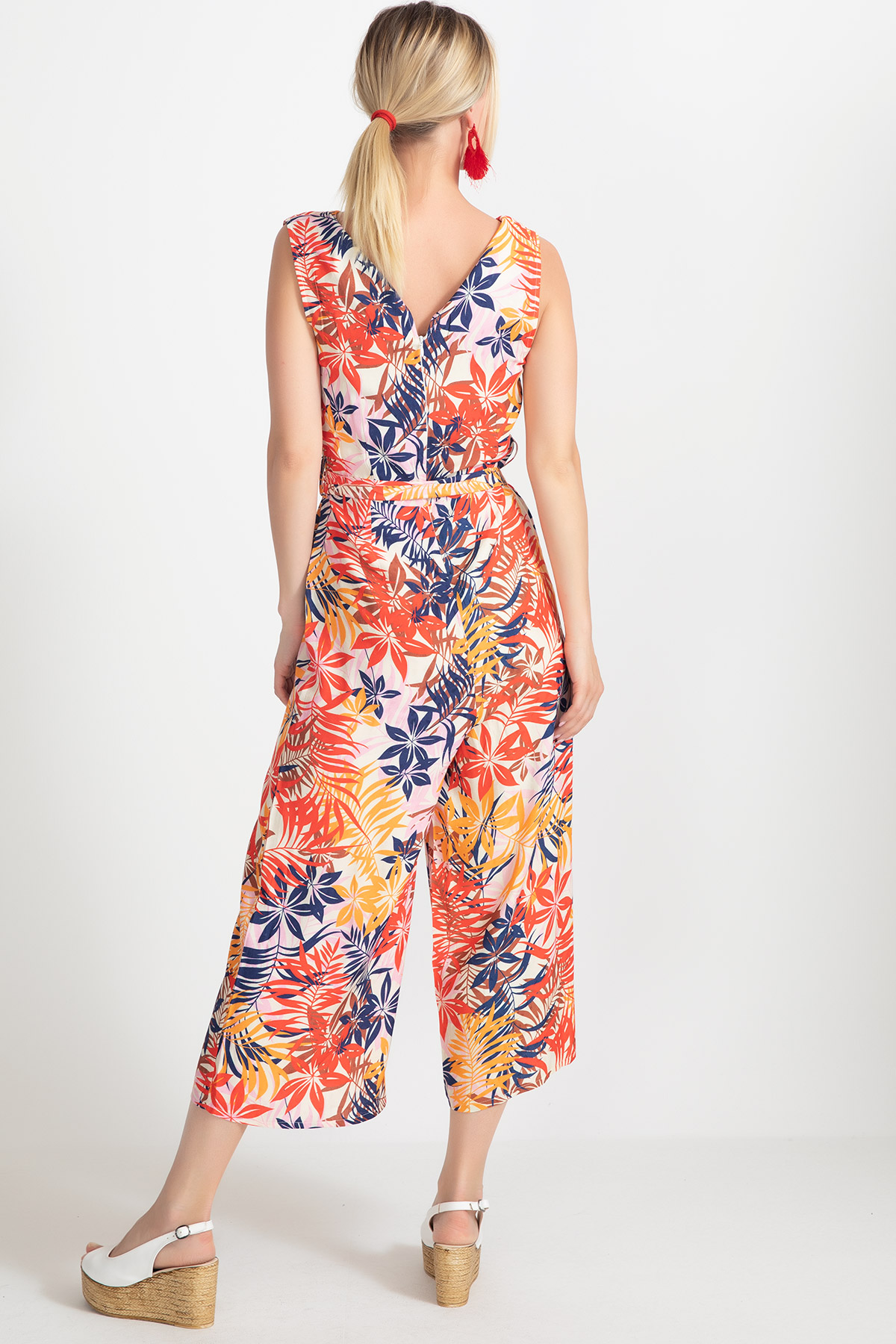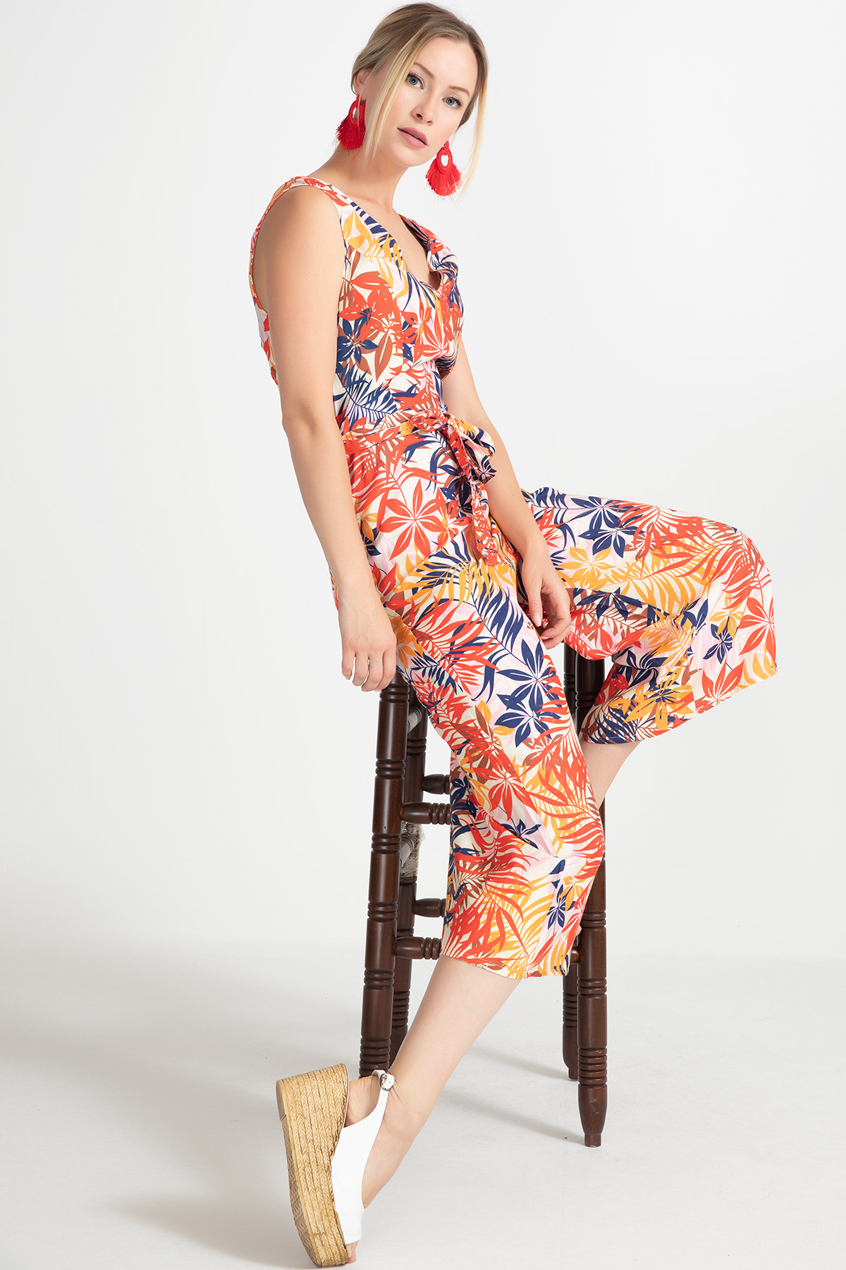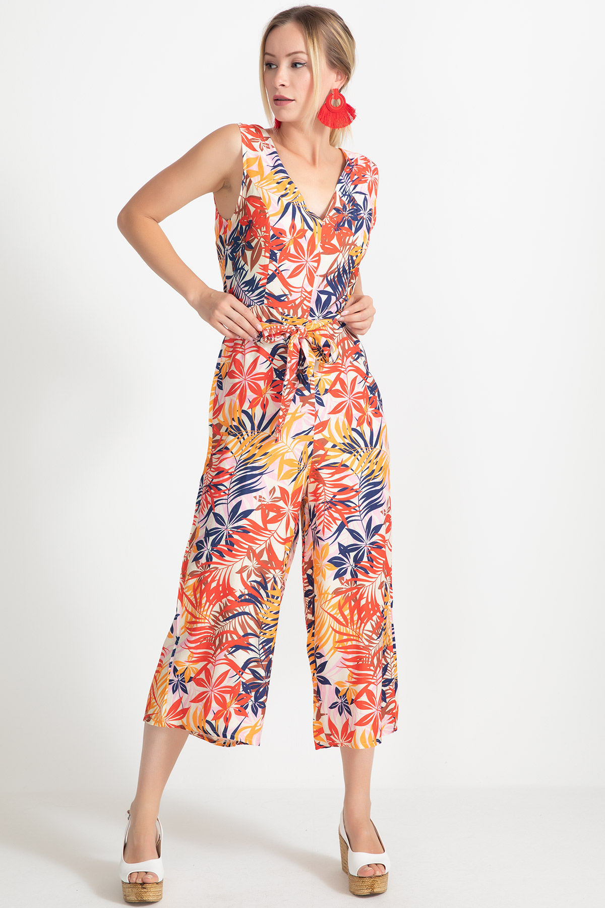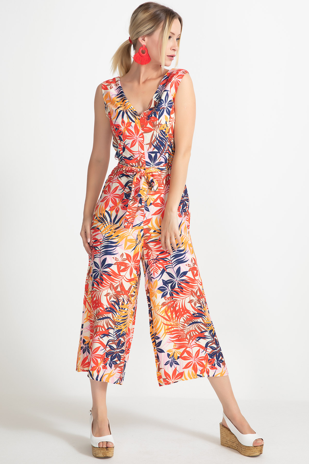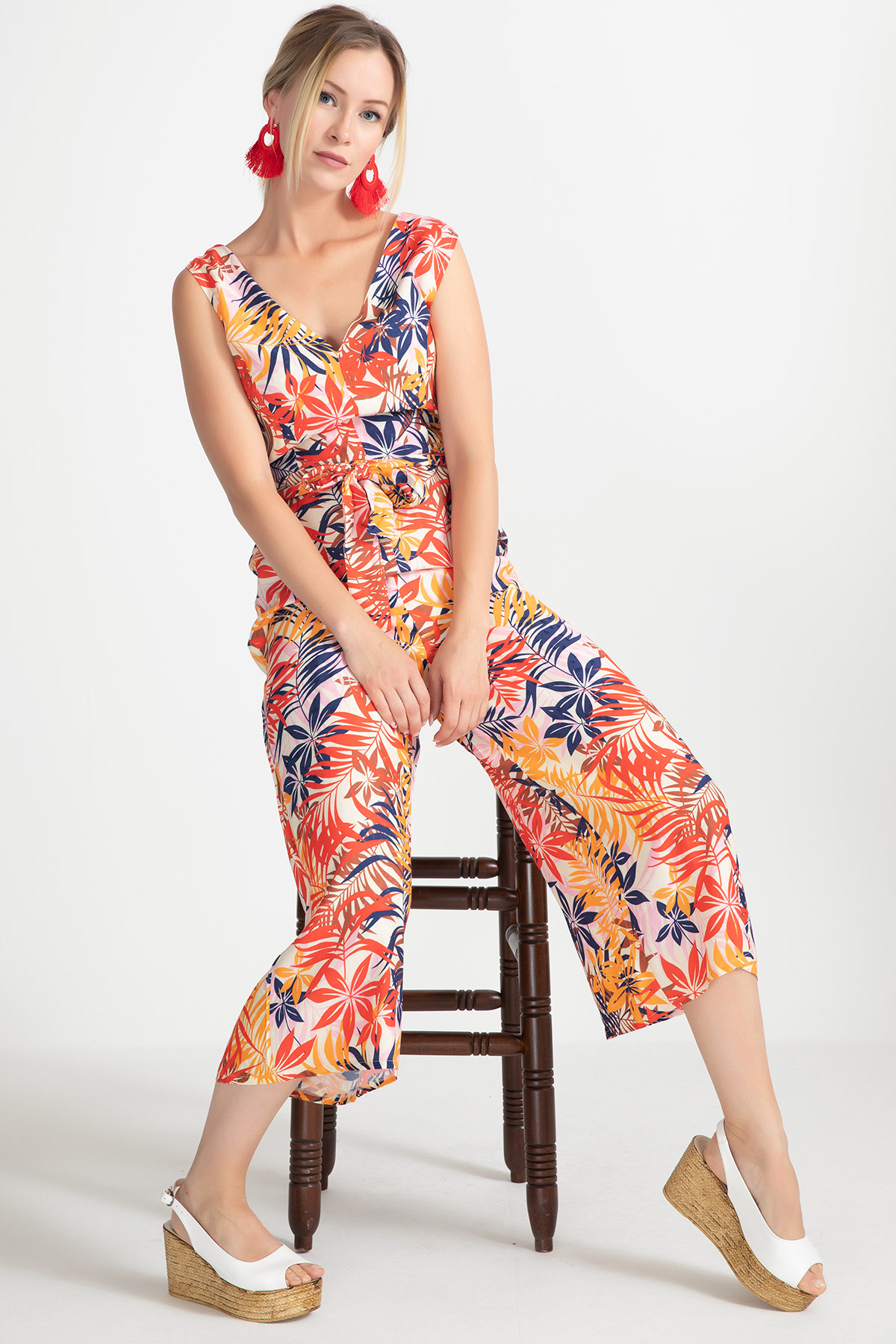 Bel Bağcıklı Desenli Tulum-Kırmızı