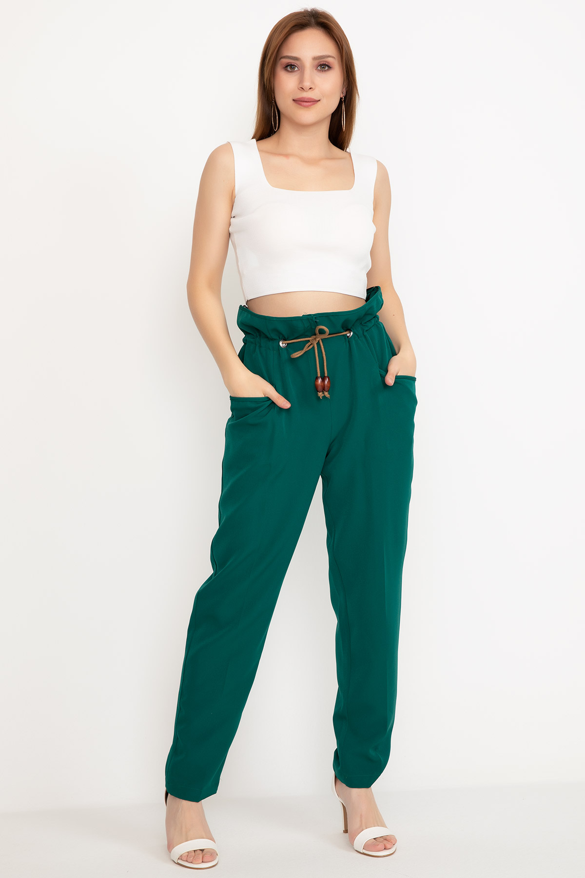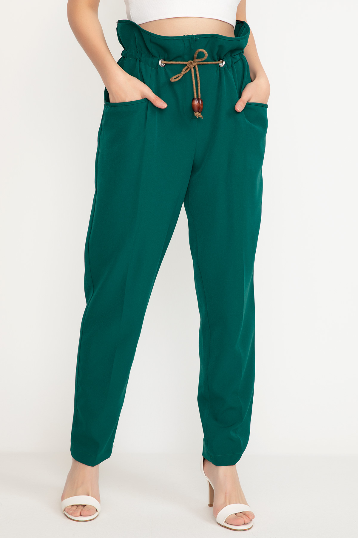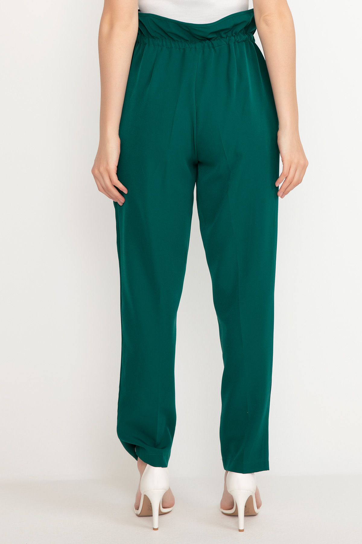 Bel Lastikli Kumaş Pantolon-KoyuYeşil