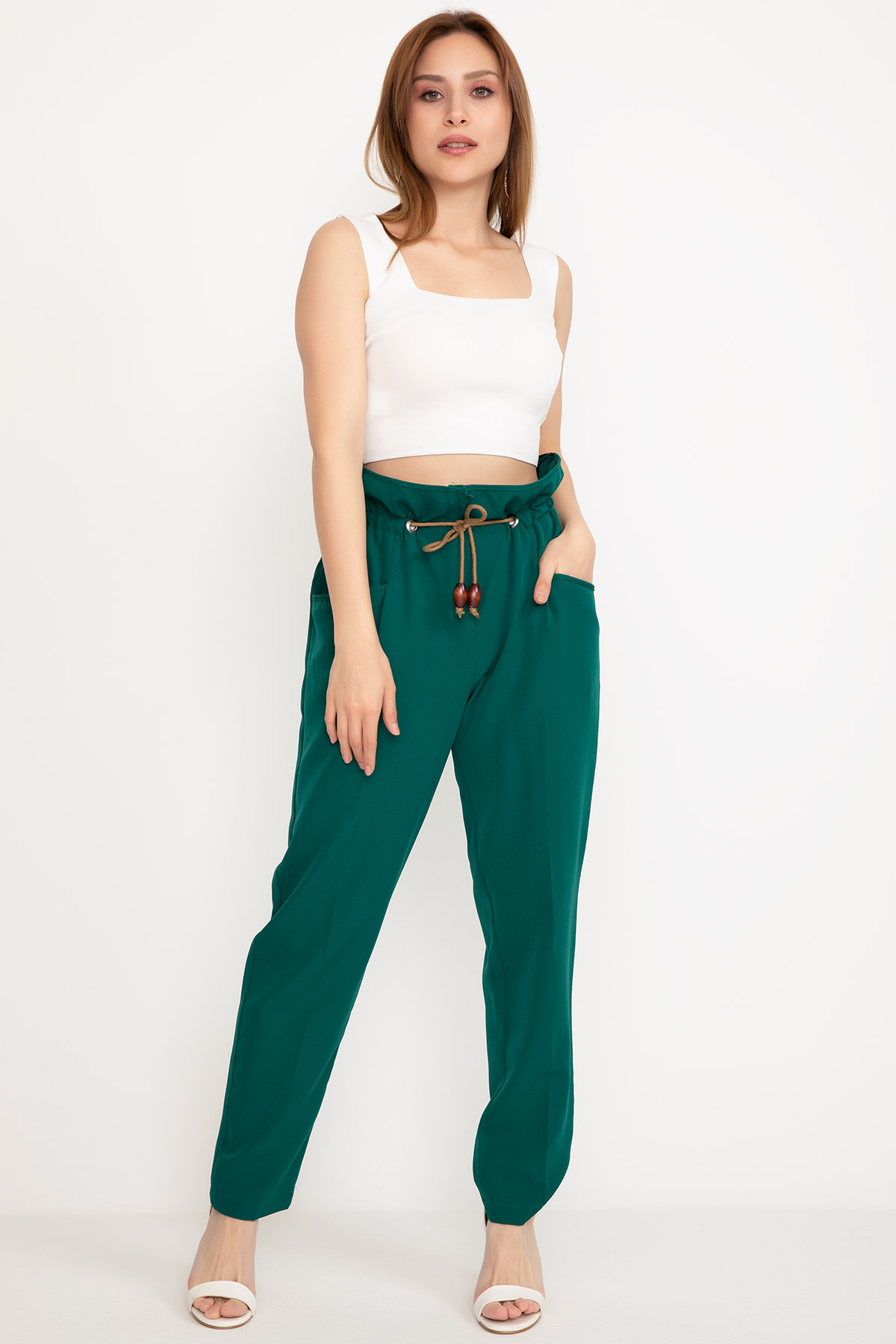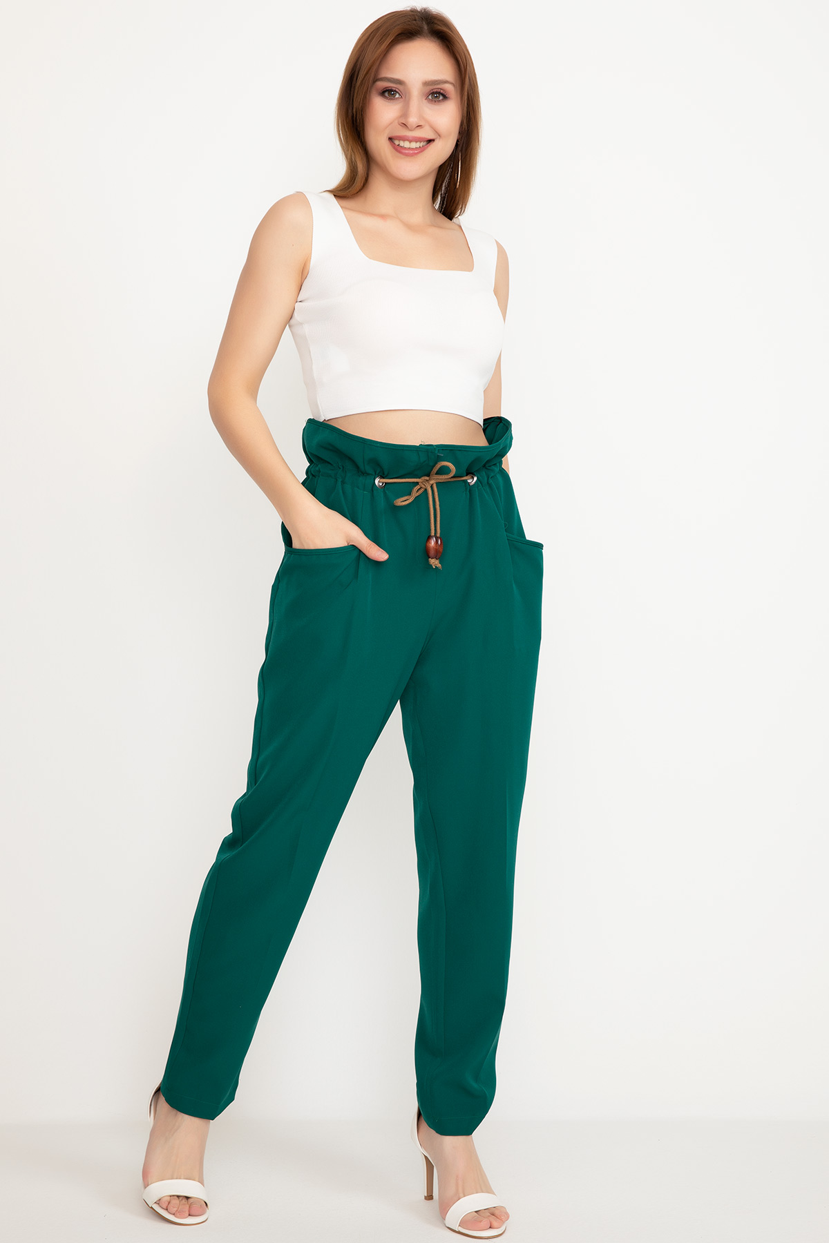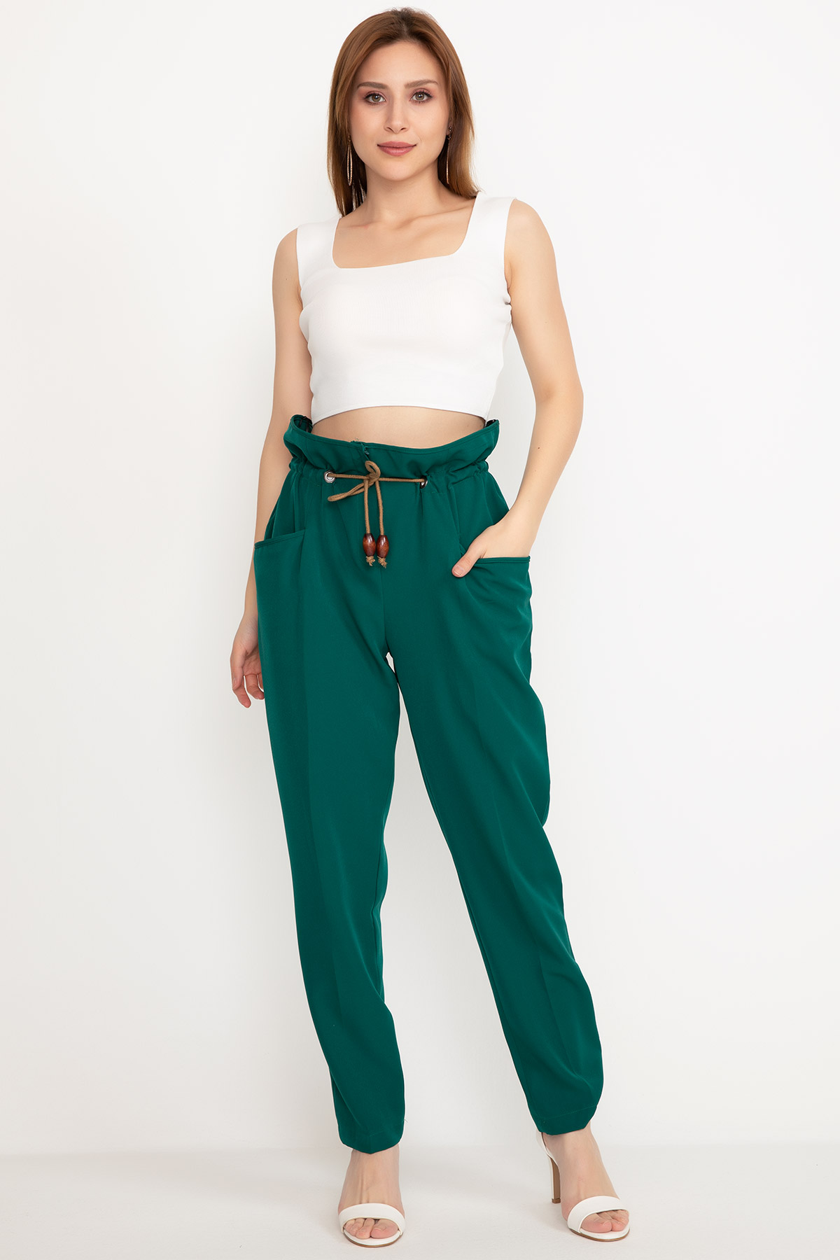 Bel Lastikli Kumaş Pantolon-KoyuYeşil