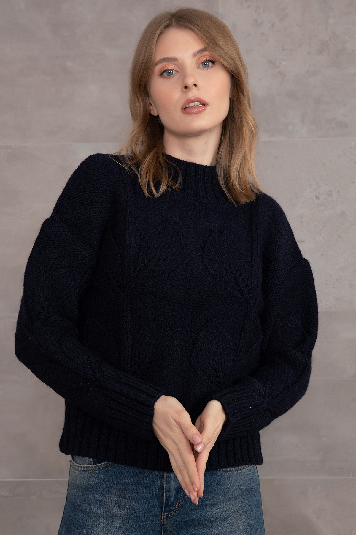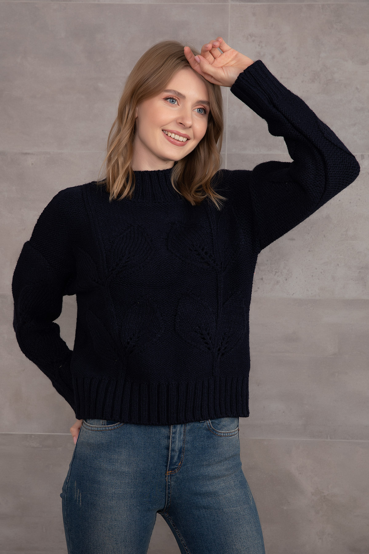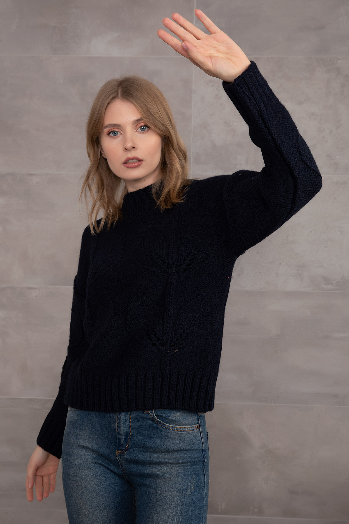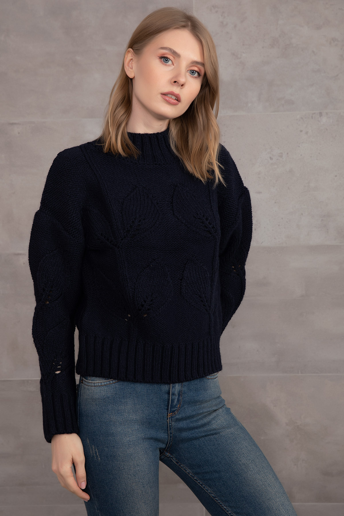 Çiçek Desenli Triko Kazak-Lacivert