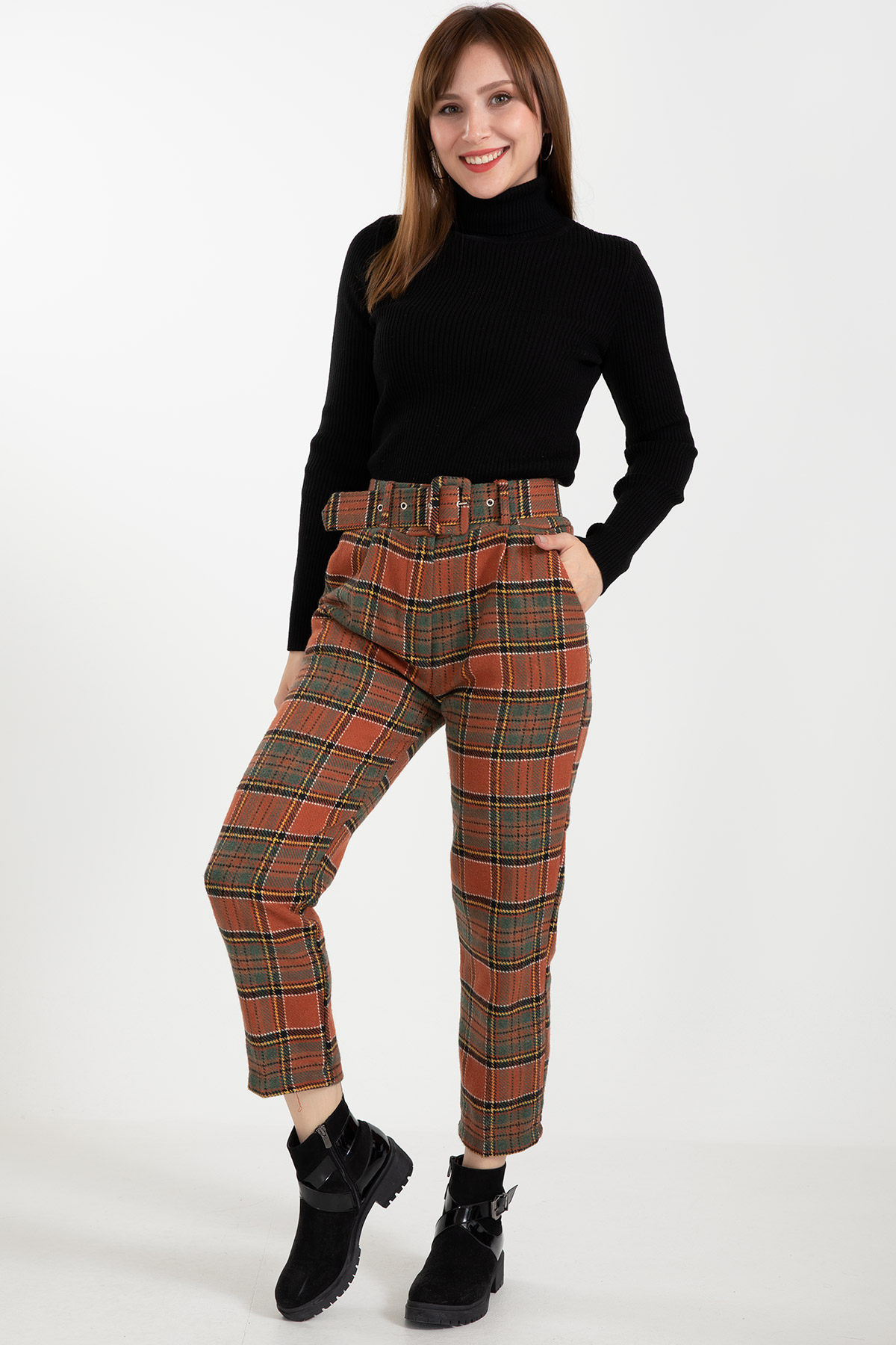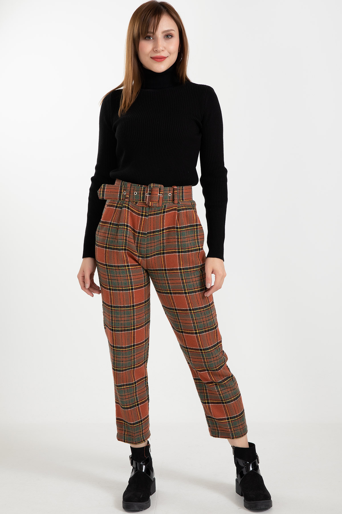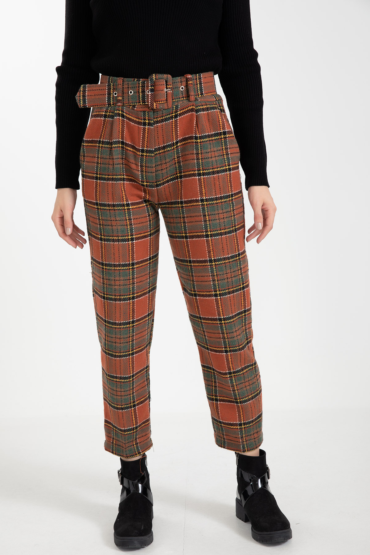 Ekose Kemerli Pantolon-Kiremit