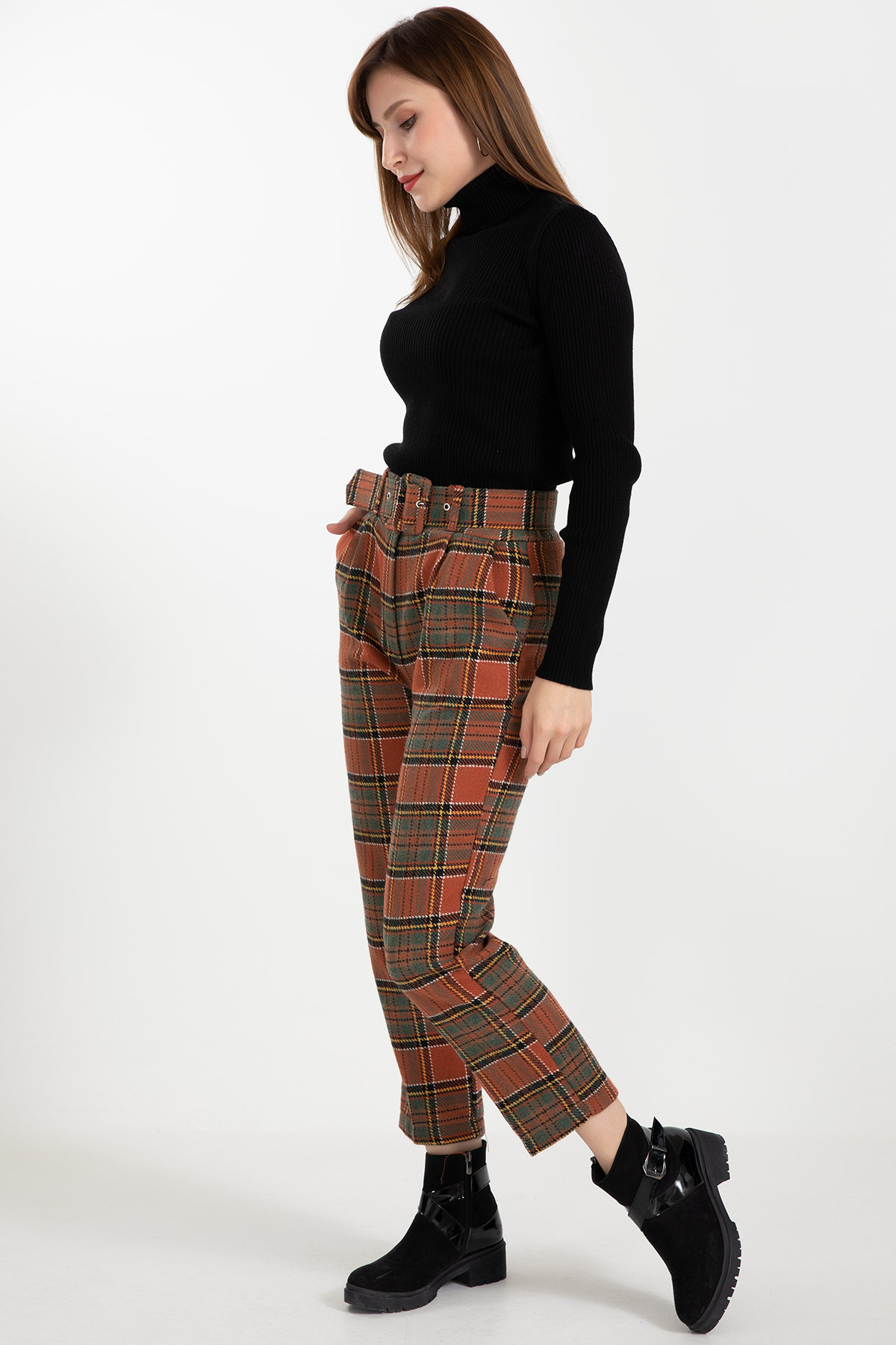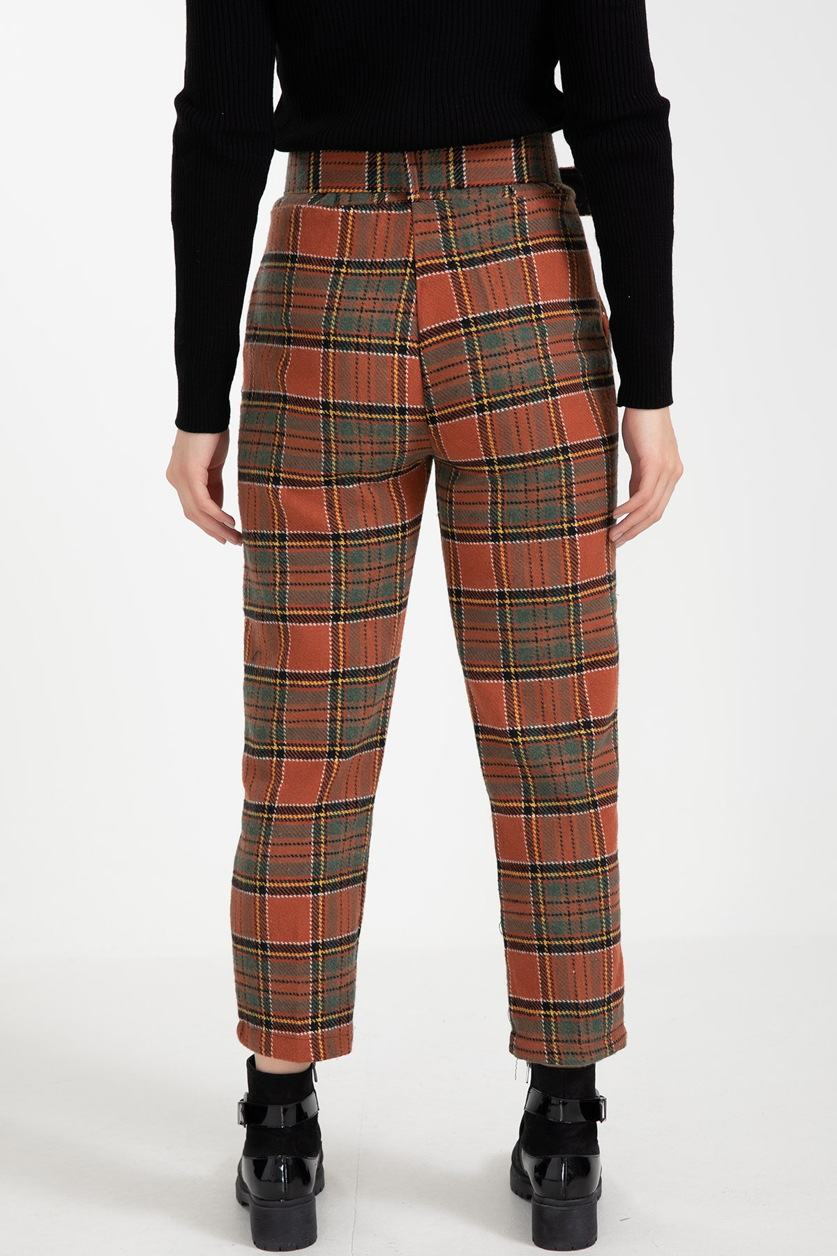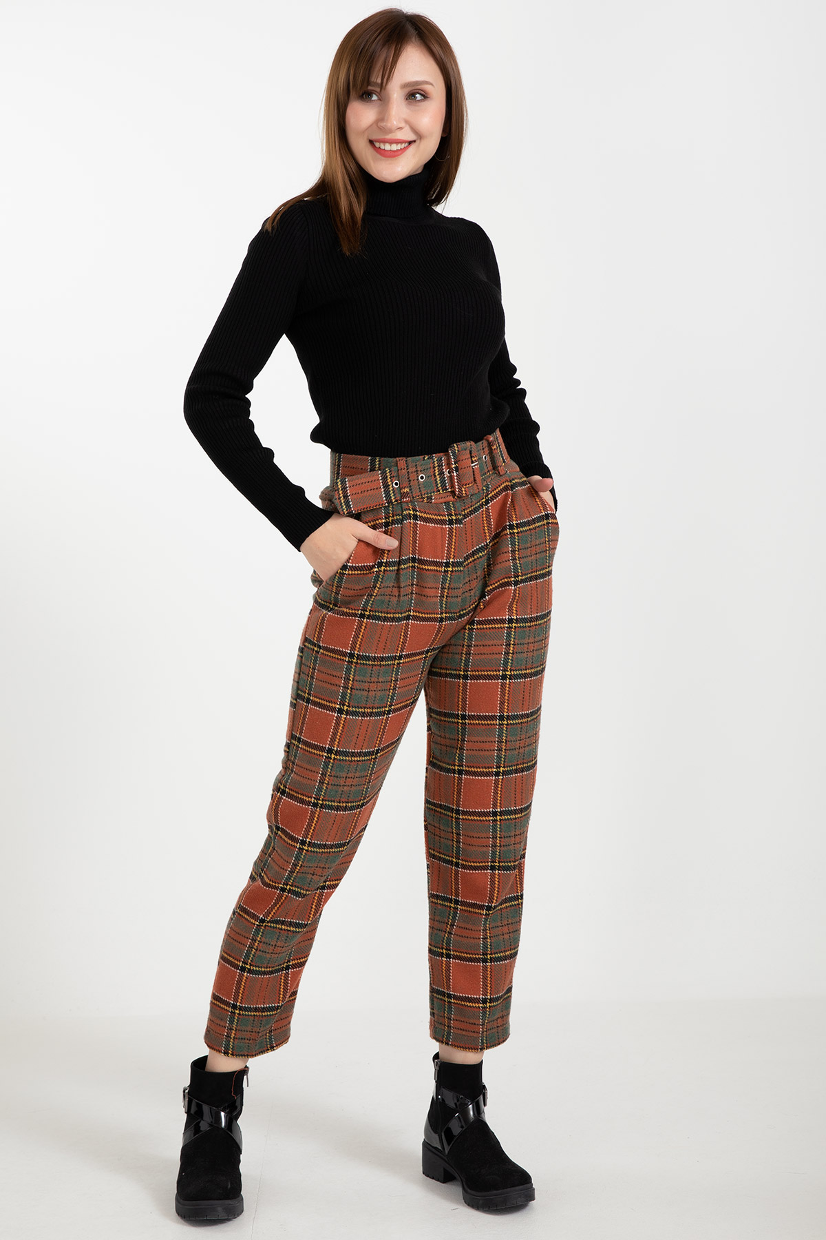 Ekose Kemerli Pantolon-Kiremit