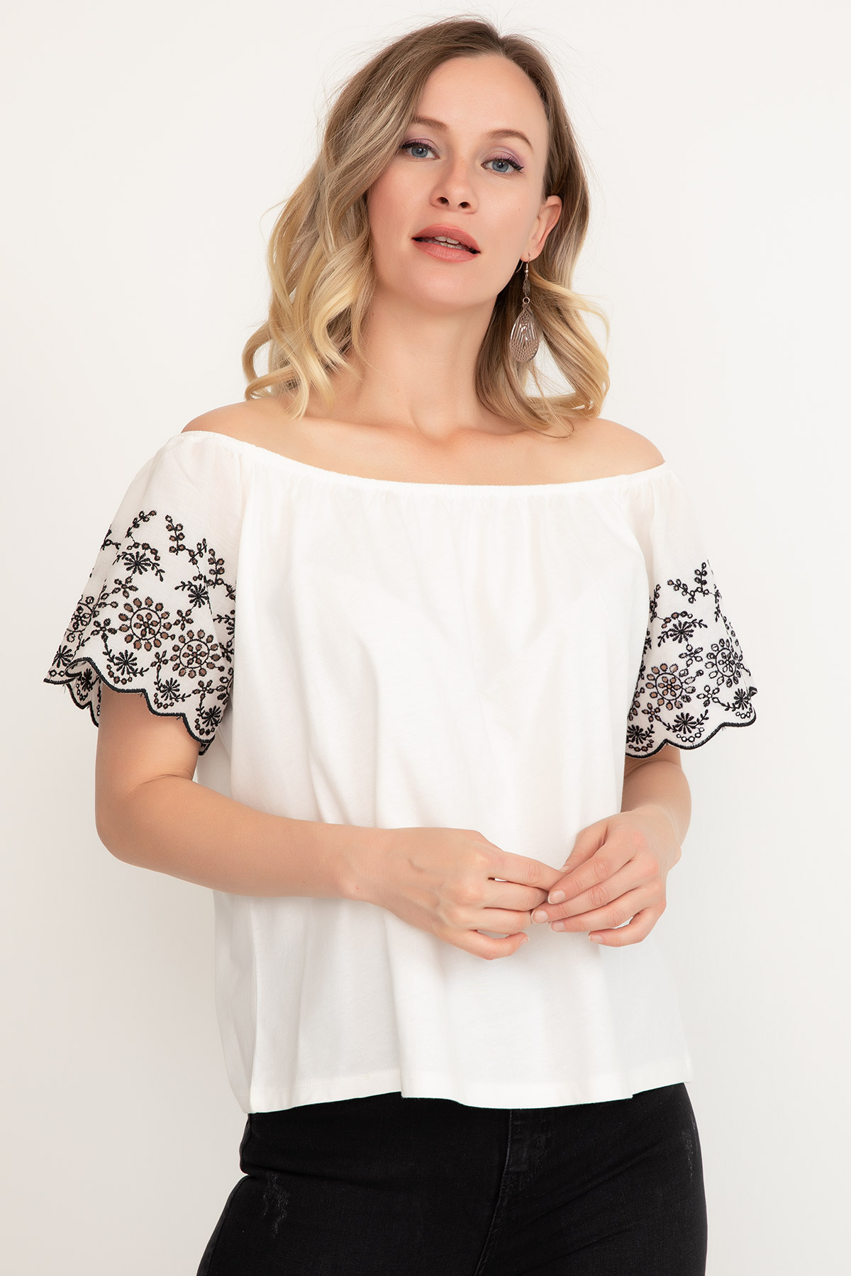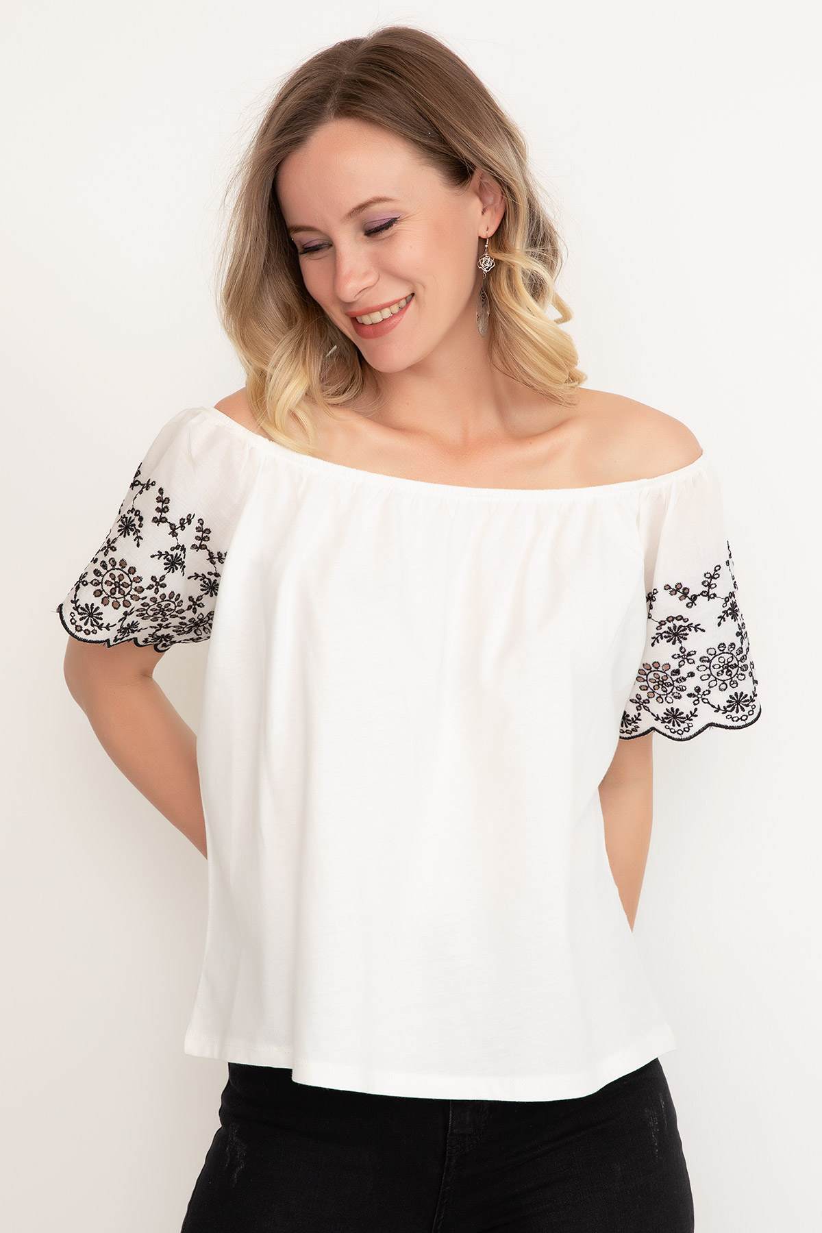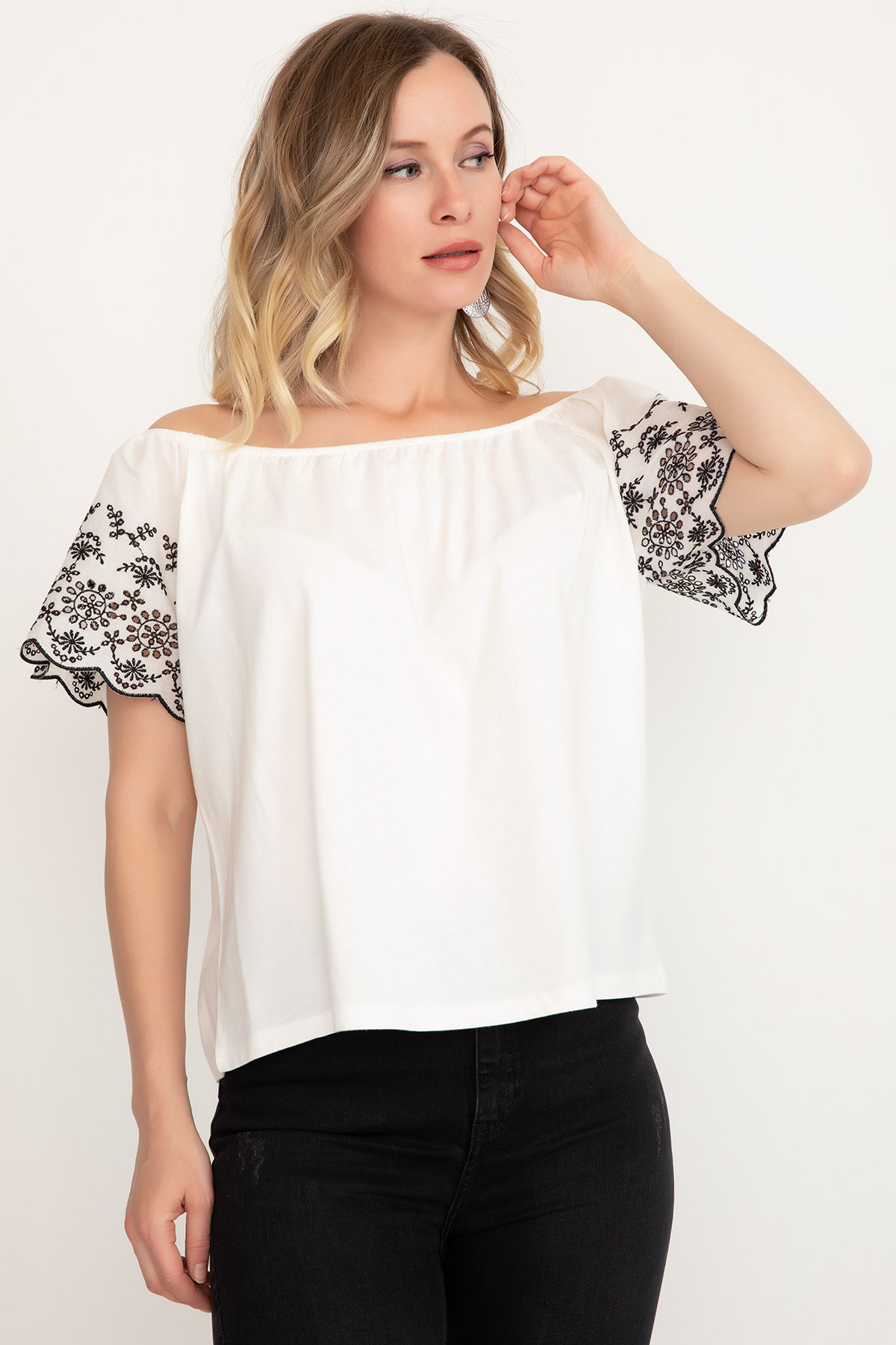 Kayık Yaka Kol Detaylı Bluz-Krem