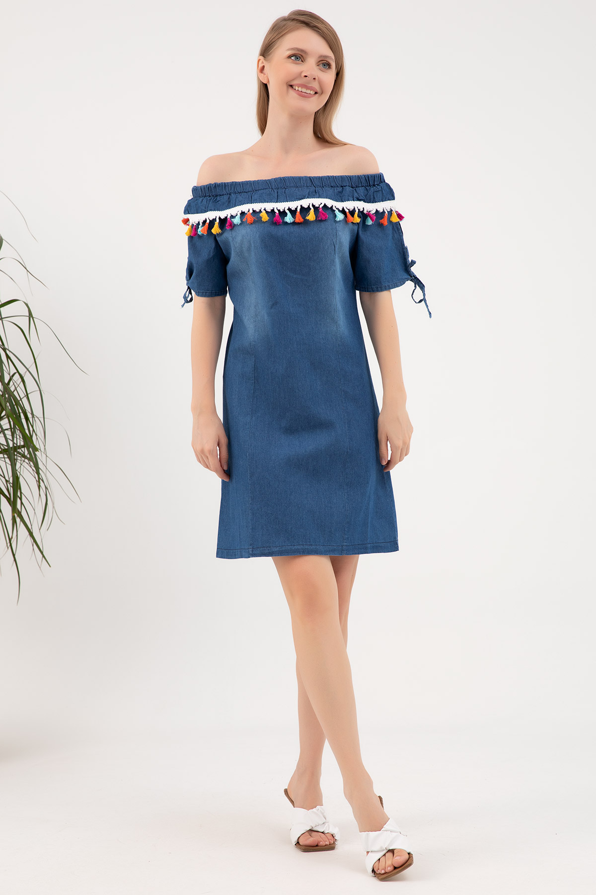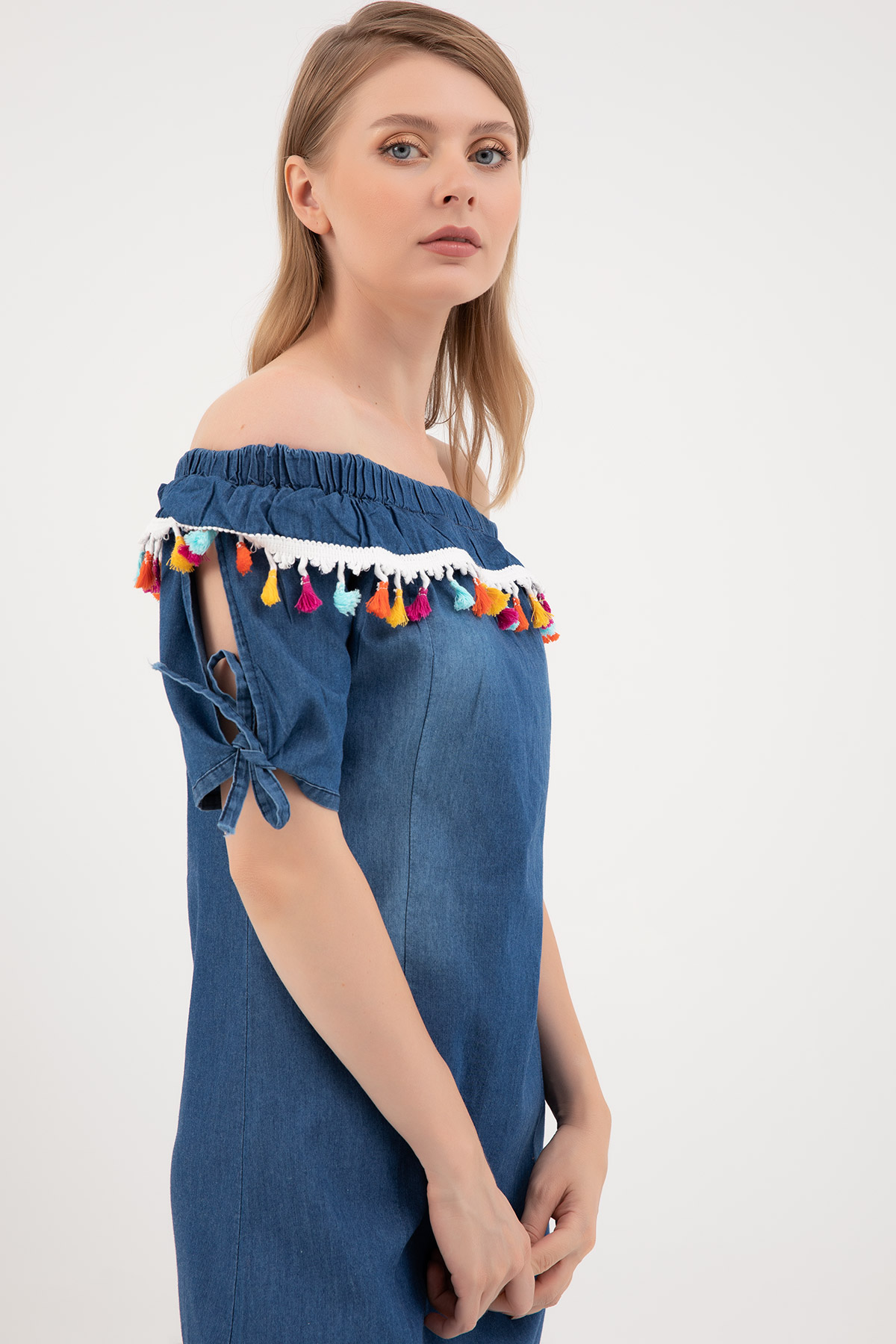 Madonna Yaka Püsküllü Elbise-Mavi