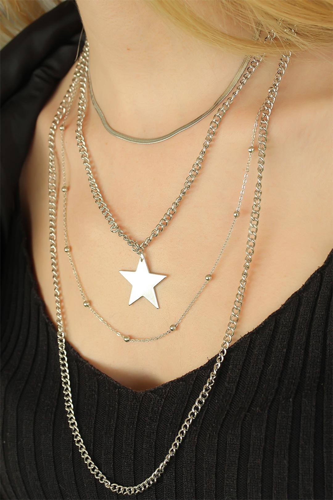 Yıldızlı Silver Renkli Çoklu Bayan Zincirli Kolye-Gümüş